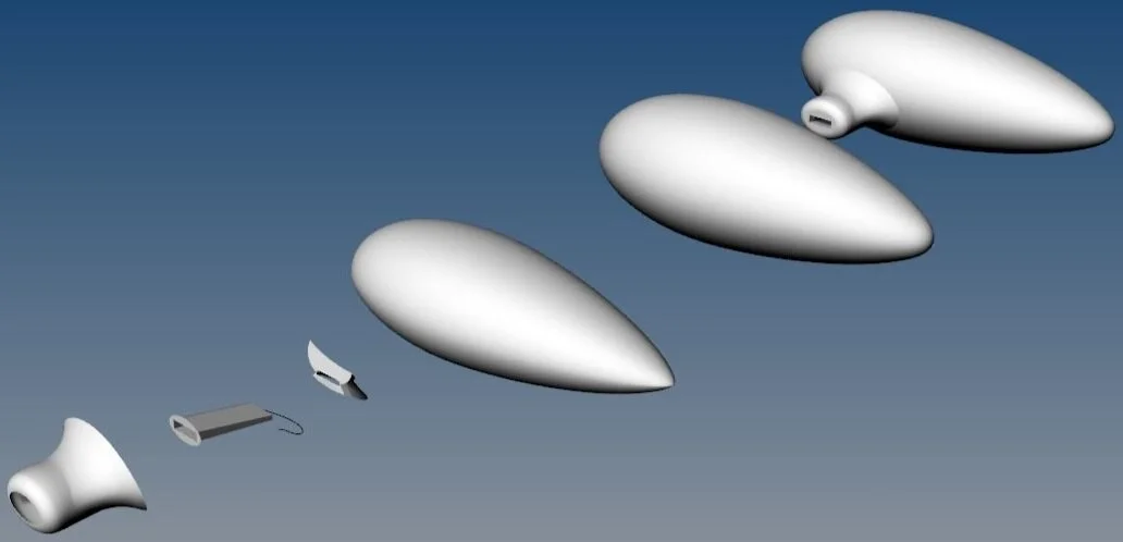 Ocarina Components, left to right: mouthpiece, windway, voicing, interior chamber, exterior surface, all combined